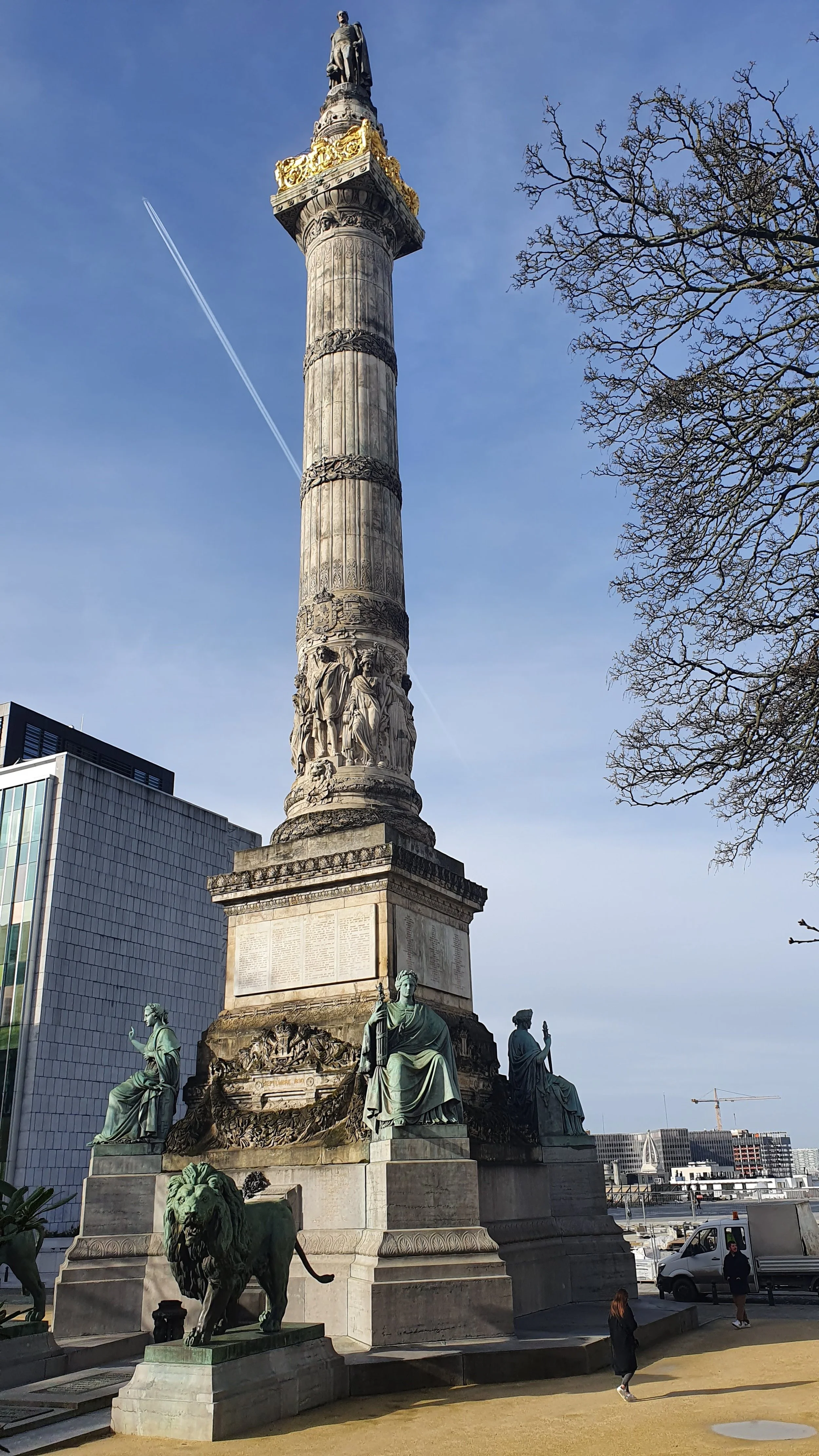 We’re kicking off today’s walk at the Congress Column—built to commemorate the creation of the Belgian Constitution by the National Congress of 1830–31. It took nine years to complete going up between 1850 and 1859. It was designed by Joseph Poelaert—yep, the same guy behind the Palace of Justice. At the top, you’ll spot King Leopold I, Belgium’s first monarch, while at the base, the four pillars of Belgian constitutional freedom—Education, Association, Worship, and Press—stand alongside an eternal flame at the Tomb of the Unknown Soldier, added in 1922. The area was originally called Place des Panoramas, thanks to its sweeping views of the city. And speaking of views—step past the Congress Column and take a look for yourself.